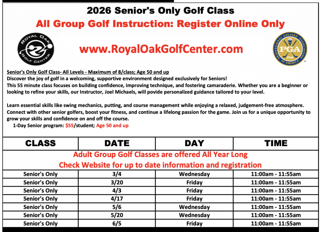 Senior’s Only Golf Class- All Levels – Maximum of 8/class; Age 50 and up